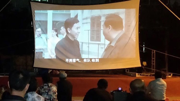 乡亲们齐聚一堂,观看爱国电影