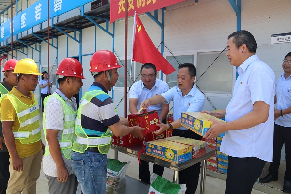 揭牌仪式结束后,结合“送清凉,战酷暑”省建设工会在行动,傅爱萍副书记与长安制药党支部书记汪立冬、万泰工会主席颜利代表省建设工会和海南万泰工会为项目工友送上了一份份防暑降温慰问品,为辛勤坚守在一线工作岗位上的劳动者带来丝丝“清凉”,也表达了对一线职工的关怀。