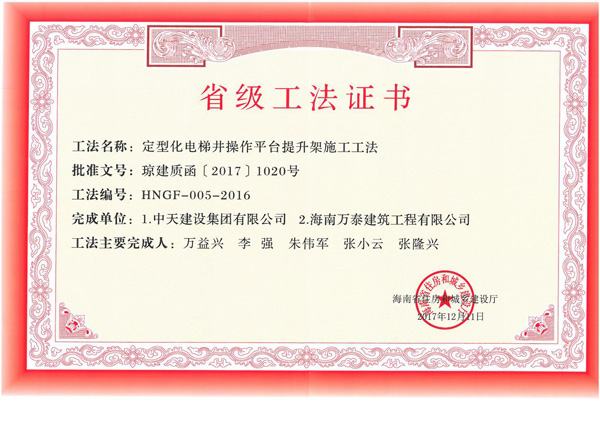 2017年12月5日,海南省住房和城乡建设厅发布公告,公布了2016年度海南省省级工法名单。海南万泰建筑工程有限公司申报的两项工法(定型化电梯井操作平台提升架施工工法、加强斜屋面施工质量的组合施工工法)名列榜单,且得票数均为13票,得票率百分之百。