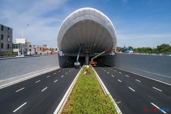 7月30日,记者随项目施工方上海城建市政工程(集团)有限公司工作人员严啸坤驱车从南渡江西段匝道驶入隧道,匝道和隧道内的沥青已铺设完毕,照明等设备全部安装完成,交通标识、标线清晰,一路穿越南渡江,几分钟就到了江东新区。