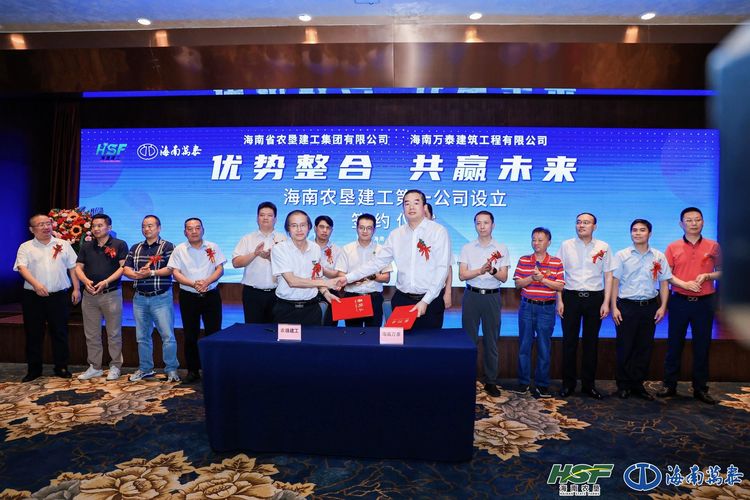 为致力于加大建筑产业创新孵化,推进建筑业转型升级,高质量高标准助力海南自贸港建设,2023年9月12日,海南万泰建筑工程有限公司与海南省农垦建工集团有限公司正式达成合作共识,合资设立“海南农垦建工第一公司”,双方签约仪式在海口迎宾馆圆满举行,预示着全新的“农垦建工一号”在海南自贸港将扬帆起航。