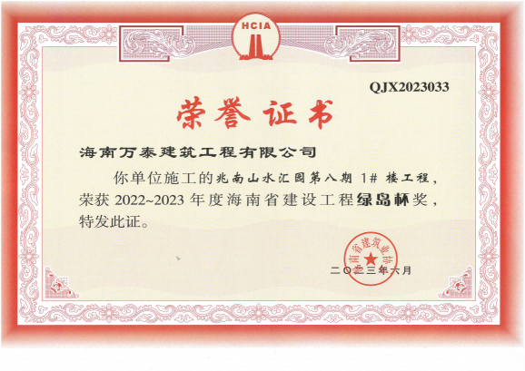 金秋九月,硕果累累。近日,海南万泰建筑工程有限公司承建的兆南·山水汇园第八期1#楼项目喜获海南省住房和城乡建设厅2022-2023年度海南省建设工程“绿岛杯”奖!