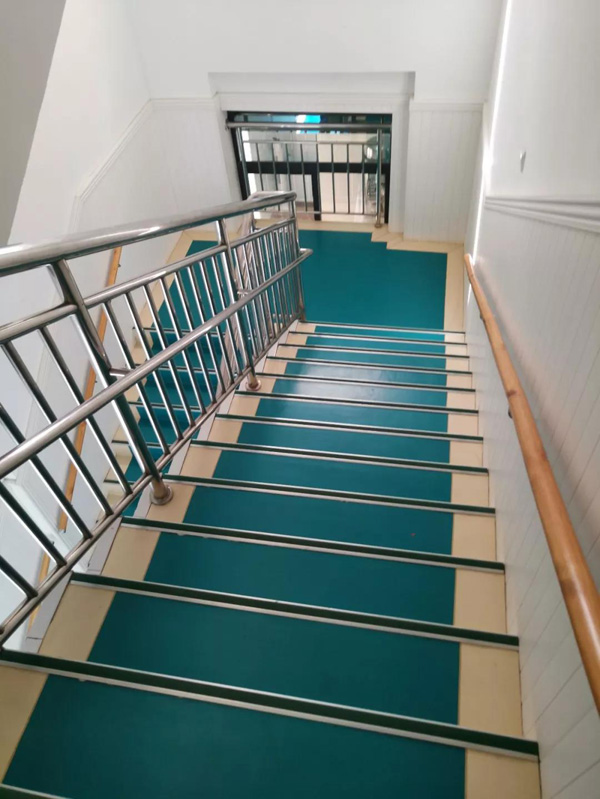 楼梯色彩搭配活泼亮眼,并在阶梯上设踏步护角,双侧除了成人扶手还特设儿童专用扶手,加强安全性。