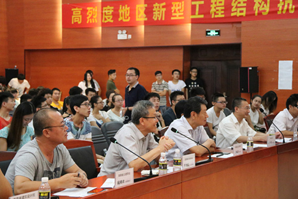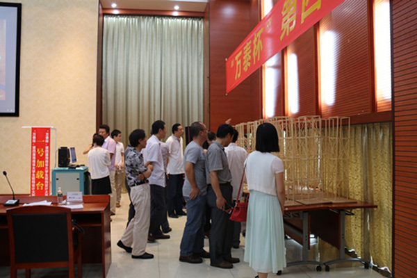 此次参赛的70支队伍按照赛前抽签顺序分别进行了加载测试。加载前,先由选手小心的将30公斤的铁块轻放在由竹皮、502胶水粘制而成的四层塔架上,塔架顶层还要放置4立升的水箱。参赛队员就其模型的设计思路、传力路径、构造特点及创新之处等方面做2分钟陈述。参赛作品各具特色,构思新颖,体现出了参赛队员扎实的力学与结构知识、活跃的思维、丰富的想象力及较强的创新意识。随后,评委老师提问,参赛队员答辩;提问内容多涉及基本力学及结构概念、模型受力性能等。之后,进行模型加载。加载共分三级,加载的控制位移依次增大;加载级数的递增不仅考验着模型的牢固性,更左右着参赛队员和观众们的心情。整个环节,工作人员各司其职,现场组织有条不紊,气氛热烈。