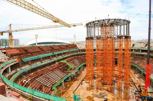 8月5日上午,在海口五源河体育馆项目施工现场,只见体育馆中心的钢屋盖中心环已现雏形。该项目土建主管陈显岛介绍,该项目预计将在今年底完成钢屋盖桁架的安装与调试。截至目前,项目总进度已超过50%,预计明年12月底可交付使用。