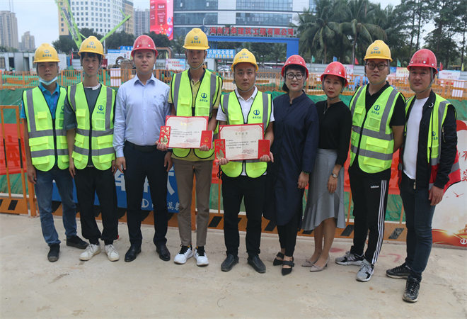 3月25日上午,根据公司安排,党支部、工会前往省政务中心项目工地现场,为参加省人力资源开发局联合省建设工会主办的“2020年海南省行业职业技能竞赛---建筑行业职业技能竞赛”并获得砌筑二等奖、三等奖的周宗清、李业伦颁发荣誉证书、高级工职业资格证书和现金奖励。