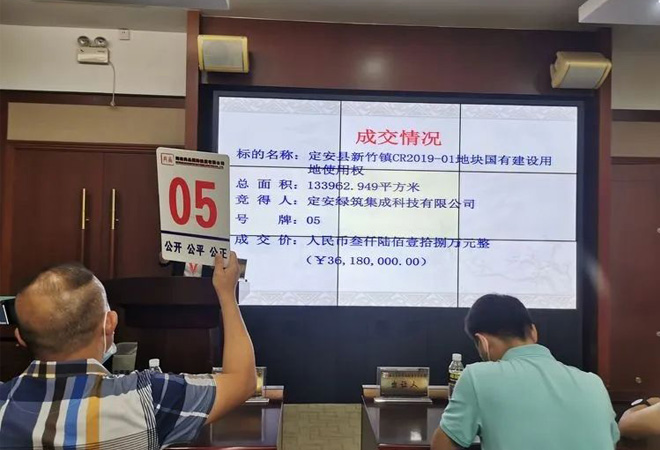 2020年4月17日上午8:30,海南绿筑装配式产业基地项目成功摘牌,该项目位于定安县新竹镇中线高速公路东侧,土地性质为二类工业用地,占地面积200.94亩,总投资6亿元。