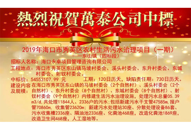 热烈祝贺海南万泰中标2019年海口市秀英区农村生活污水治理项目(一期)-东山镇(四标段)