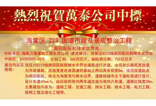 热烈祝贺海南万泰中标海棠区223国道市政及景观整治工程南田医院到陵水交界处项目