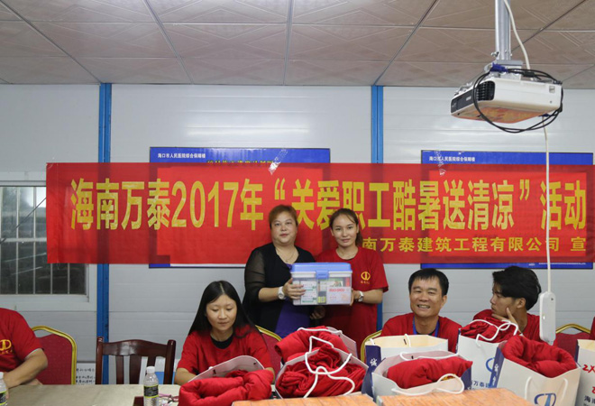 为表达公司对长期驻扎在工地一线工人的关怀之情,传达公司各级领导及同事的深切慰问,7月10日下午,万泰公司副总高长水、张宇,主任秦启武带领万泰公司相关人员前往海口市人民医院综合保障楼项目部,为项目工人送去菊花茶、T恤、应急药品等一批慰问物资。